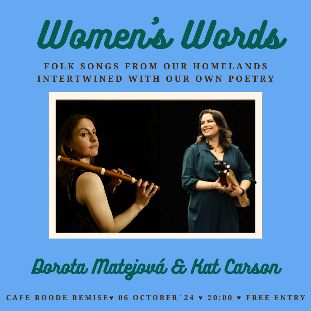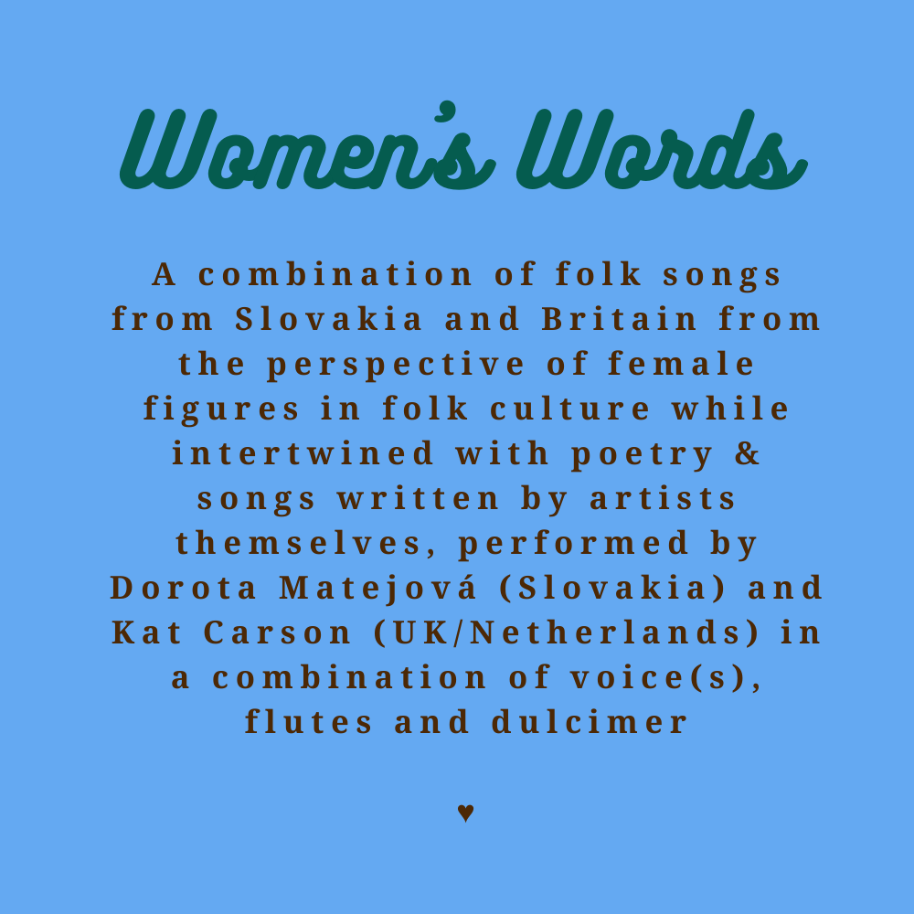 Two friends and musicians, Dorota Matejová (Slovakia) and Kat Carson (UK/NL) who usually perform in the early music ensemble Nymphes et Monstres, come together in an intimate setting combining folk songs from their home countries Slovakia and Britain. The chosen songs are all “women´s words”; songs written from the perspective of female figures, often singing about the simple but deep, and sad but beautiful parts of life: love, nature, solitude and human connection. These songs have specific poetic styles and melodies typical to the folk traditions of these two countries. Dorota and Kat will perform in their native languages, intertwining them with instrumental improvisation upon the songs´ themes.
