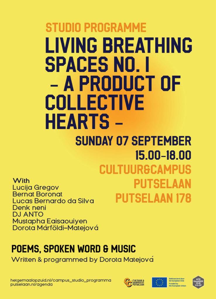 07 SEPTEMBER: Living Breathing Spaces no. I – a product of collective hearts – | MUSIC & POETRY by Lucija Gregov – Denk neni – Bernat Boronat – Lucas Bernardo – Mustapha Eaisaouiyen – Dorota Márföldi-Matejová with introduction by Janneke Absil & Kim Bouvy + collective music & poetry making | 15:00 – 18:00 | Cultuur & Campus Putselaan, Putselaan 178, Rotterdam | open to all + free entrance | read more about the event and the idea behind