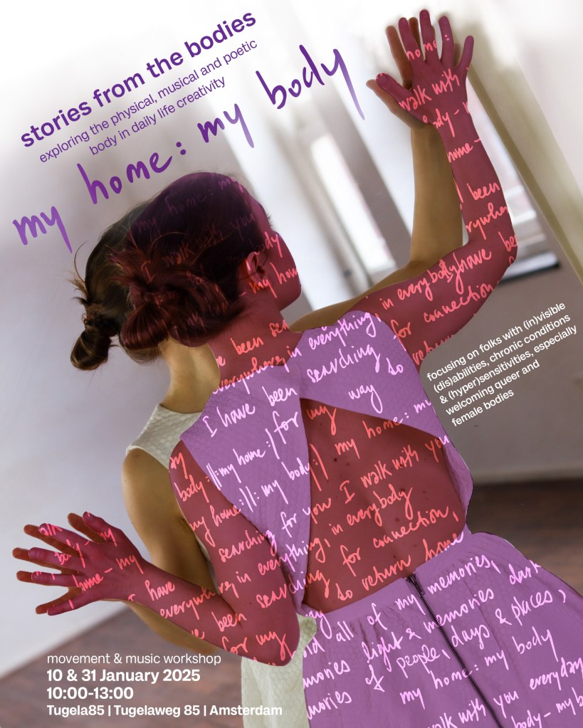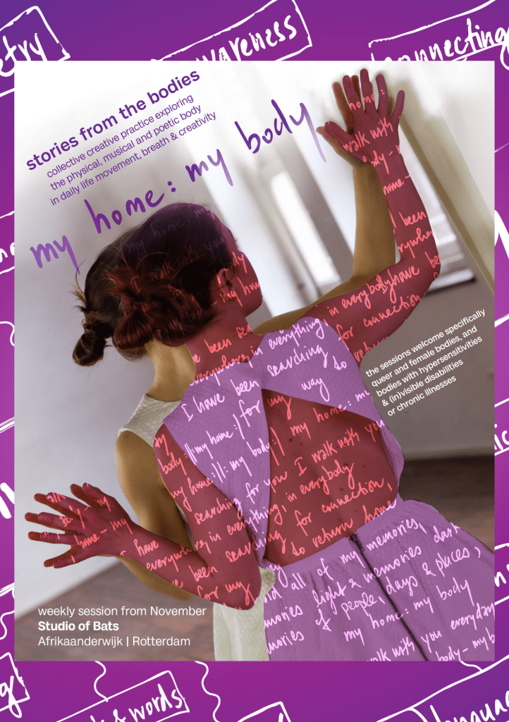 Stories from the Bodies workshop series encourage the development within everyBODY’s own physical and creative abilities, and is developed with a specific focus for folks with visible or invisible (dis)abilities, hypersensitivities, chronic illness, burn-out situations or other physically or mentally related specifications. The course welcomes specifically queer and female bodies and bodies that might not always feel safe or comfortable in regular spaces. More information here: https://tugela85.nl/nieuws/1367/my-body-my-home-stories-from-the-bodies