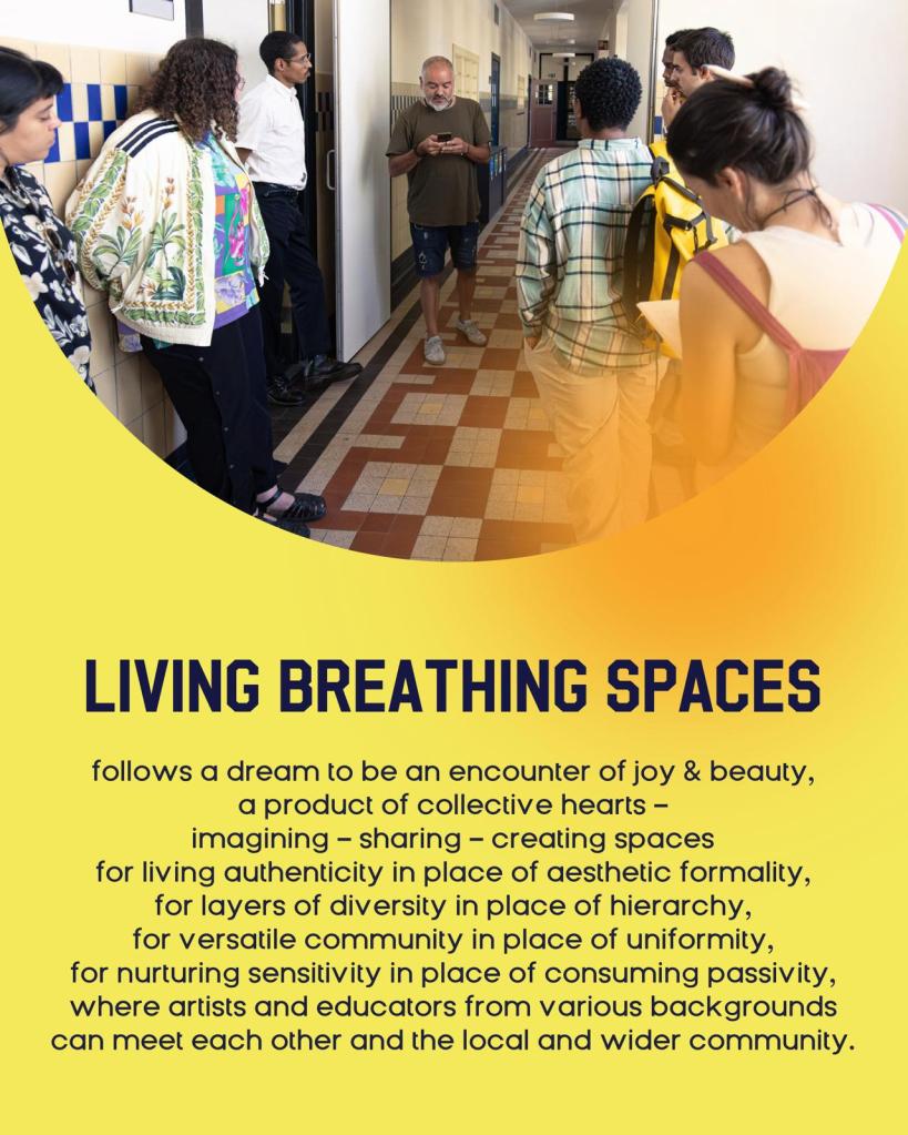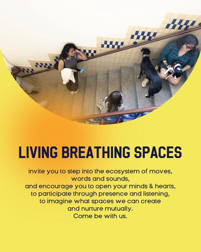 For the second edition of Living Breathing Spaces – a product of collective hearts – we invite you, the audience, to transform this space into what we wish it to be: a place of human connection, welcoming authenticity, expression and collective creativity. Through the guidance and performing presence of four Rotterdam-based artists, experienced both in their diverse performance practice as well as in practices of experimental education, self-taught learning, creative teaching and collective learning, we will make a collective performance-improvisation with sounds, words and moves that will resonate through the spaces of the building.